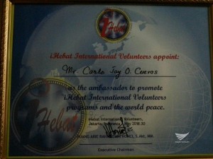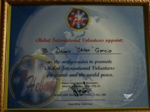 The plaque and the appointment was given by an Indonesian organization, the I-Hebat International Volunteers.