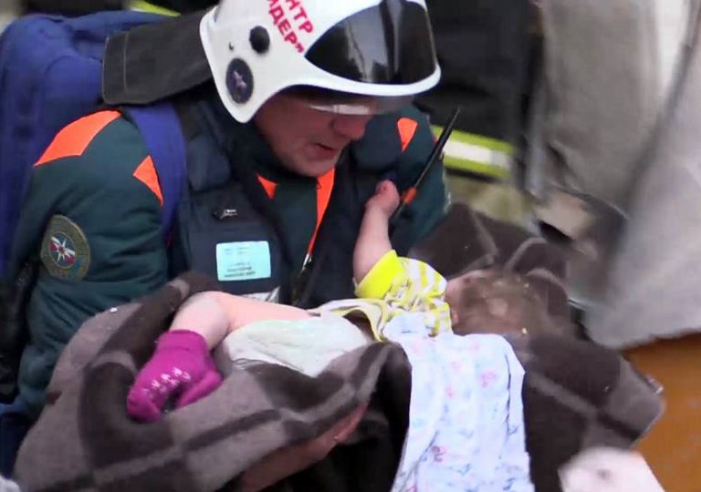 This handout still image taken from video footage released by The Russian Emergency Situations Ministry on January 1, 2019, shows a rescuer carrying a 11-month-old child said to have been found alive, after a gas explosion rocked a residential building in Russia’s Urals city of Magnitogorsk. – Russian rescuers have been forced to temporarily halt the search for dozens of missing people in the rubble of a collapsed high-rise apartment block as the building risked crumbling further, officials said on January 1, 2019, with the incident claiming at least seven lives. Part of the 10-storey building collapsed following a gas explosion on the morning of December 31, 2018, in the industrial city of Magnitogorsk, nearly 1,700 kilometres (1,050 miles) east of Moscow in the Ural mountains. (Photo by HO / RUSSIAN EMERGENCY SITUATIONS MINISTRY / AFP)