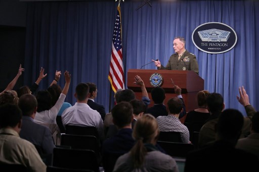 Gen. Joseph Dunford Jr. Chairman of the Joint Chiefs of Staff, briefs the media on the recent military operations in Niger, at the Pentagon on October 23, 2017 in Arlington, VA. Four U.S. Army Special Forces members were killed on Oct. 4 in Niger by militants, armed with rocket-propelled grenades and heavy machine guns. Mark Wilson/Getty Images/AFP