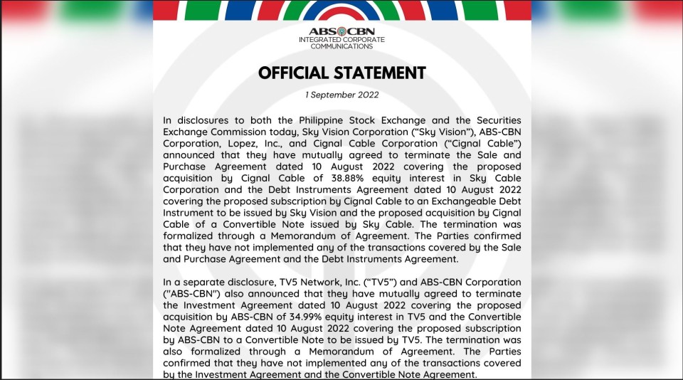 In another disclosure to both the PSE and the SEC also on Thursday, “Sky Vision Corporation (“Sky Vision”), ABS-CBN Corporation, Lopez, Inc., and Cignal Cable Corporation (“Cignal Cable”) announced that they have mutually agreed to terminate the Sale and Purchase Agreement” dated August 10, 2022 that covered the proposed acquisition by Cignal Cable of 38.88% equity interest in Sky Cable Corporation.