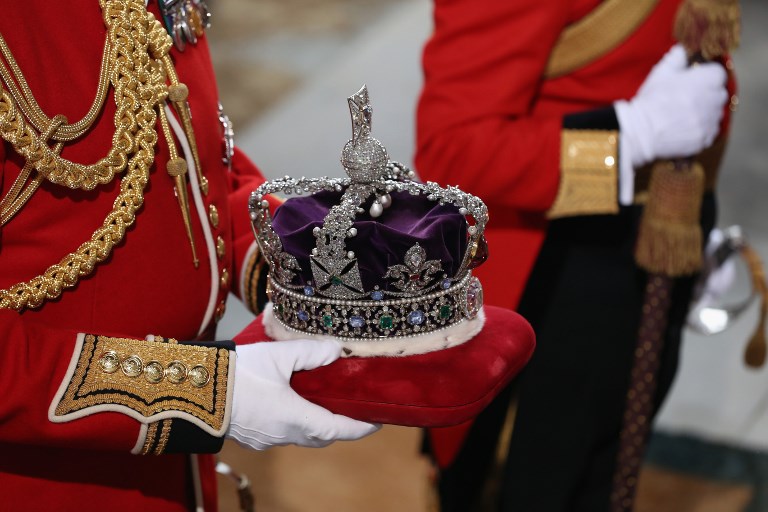The crown, made for King George’s coronation in 1937, is set with 2,868 diamonds including 17 sapphires, 11 emeralds and hundreds of pearls, including four known as Queen Elizabeth I’s earrings.
