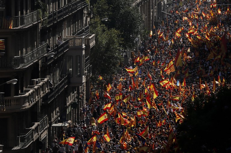 Ten of thousands of flag-waving demonstrators packed central Barcelona to rally against plans by separatist leaders to declare Catalonia independent following a banned secession referendum. Catalans calling themselves a “silent majority” opposed to leaving Spain broke their silence after a week of mounting anxiety over the country’s worst political crisis in a generation.
