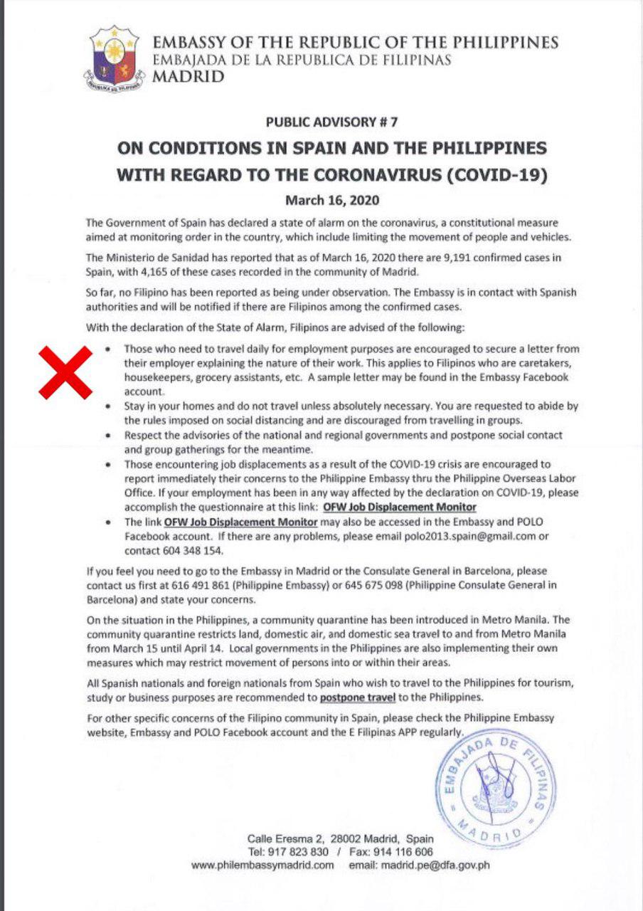 Below is a released letter from the Embassy of the Republic of the Philippines with regards to Overseas Filipino Workers (OFWs) living in Spain.
