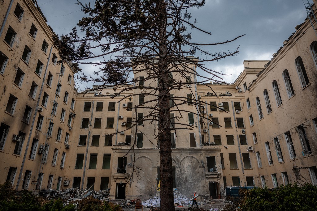 Located on the central Freedom Square, the monumental 1950s building was struck by a missile on March 1. The video of the powerful strike was seen worldwide.