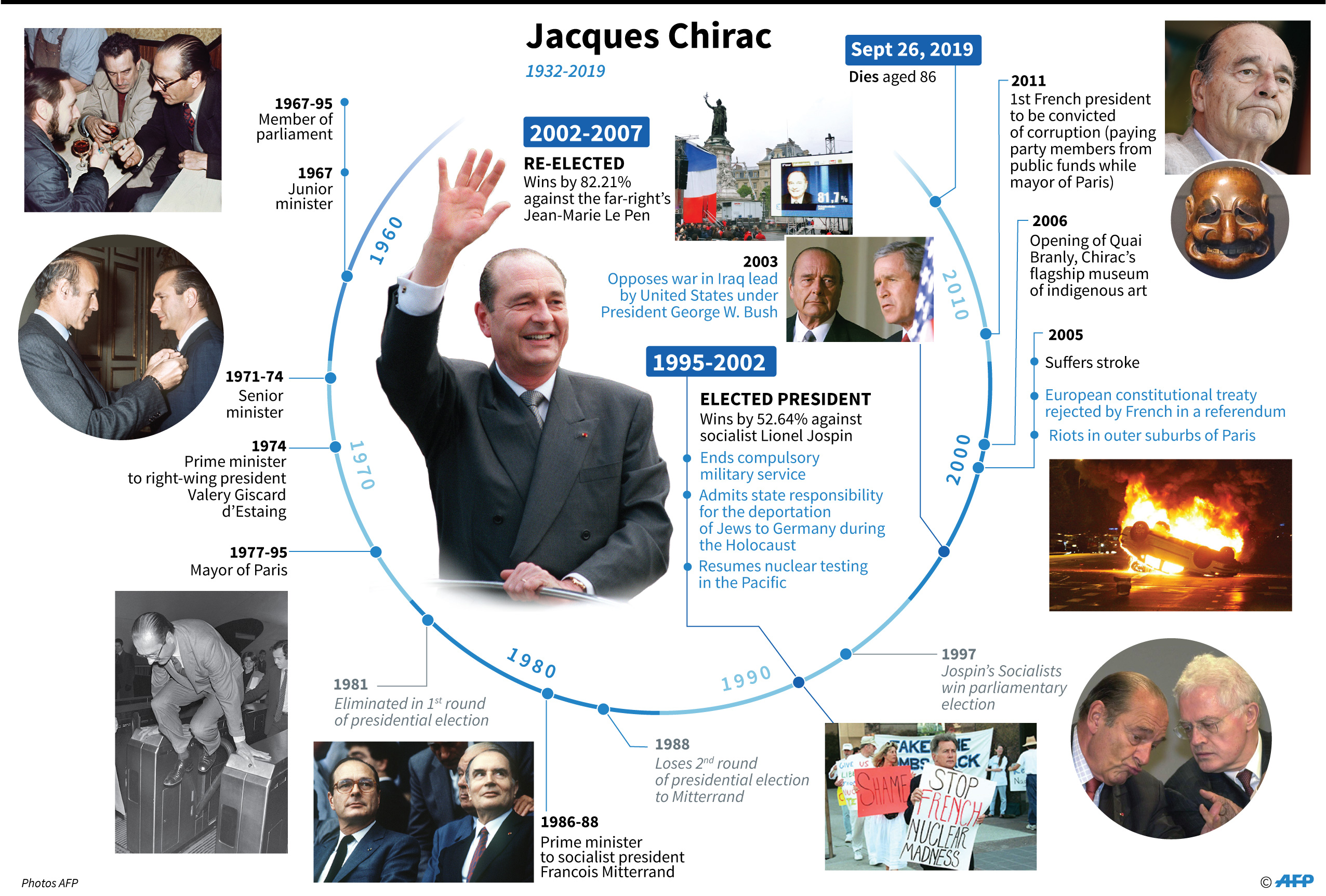 Chirac’s 12 years in the Elysee Palace in two mandates made him France’s second longest-serving postwar president after his Socialist predecessor Francois Mitterrand.