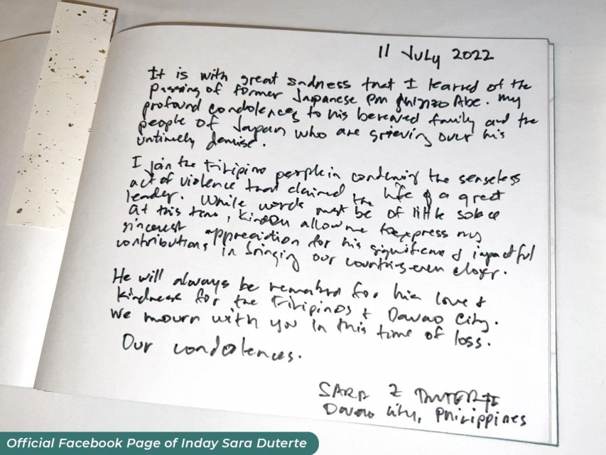 Duterte’s daughter, Vice-President Duterte, also conveyed her “deepest condolences” to Abe’s family and the Japanese people for Abe’s untimely death.