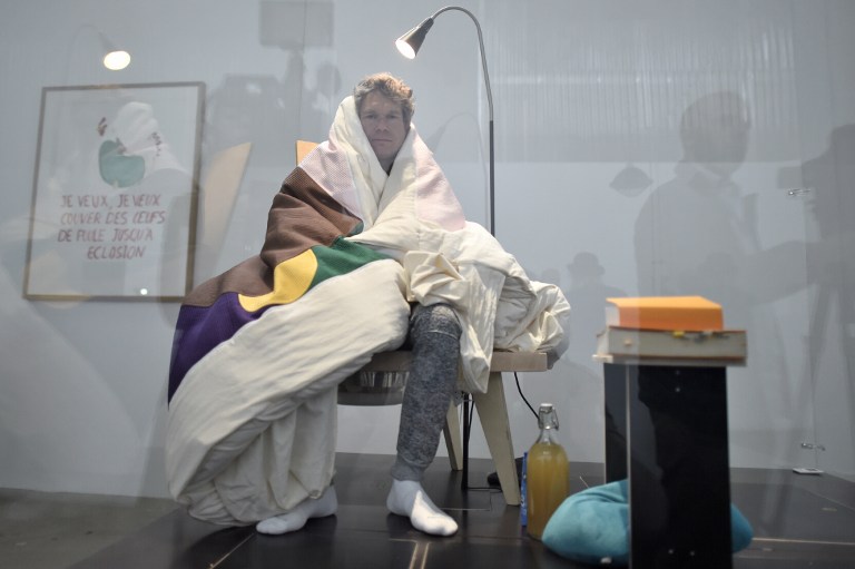 Abraham Poincheval aims to become a “human hen” by sitting and laying on the eggs inside a glass vitrine at a Paris modern art museum until the chicks emerge.