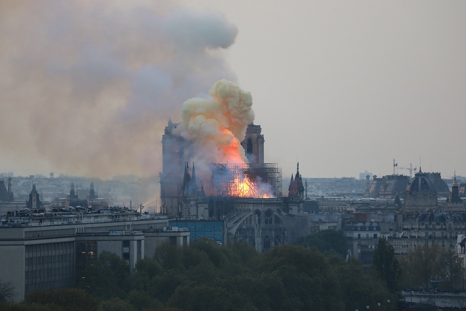 A colossal fire swept through the famed Notre-Dame Cathedral in central Paris on Monday, causing a spire to collapse and threatening to destroy the entire masterpiece and its precious artworks.