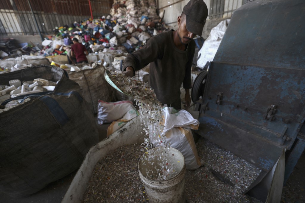 “We get the plastic from workers who collect it from the street. We buy it from them, then we separate it and grind it through a special machine,” said Imad Hamed, whose hands are stained black from the work.