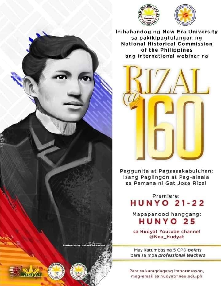 (Eagle News) – Magsasagawa ng isang international webinar ang New Era University kaunay sa paggunita sa ika-160 na kaarawan ni Dr. Jose Rizal na may premiere ngayon Hunyo 21 hanggang sa Hunyo 22, 2021.