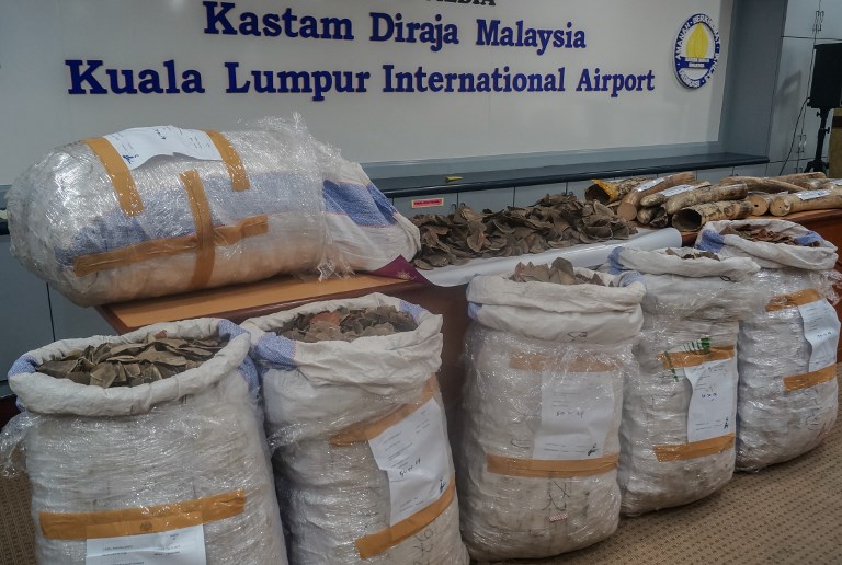 Malaysia has seized a shipment of elephant tusks and pangolin scales worth almost a million USD, an official said on August 2, the latest discovery or rare animal parts illegally trafficked into the country. / AFP PHOTO / ROYAL MALAYSIAN CUSTOMS