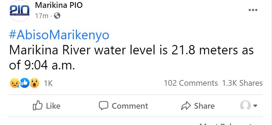 Marikina River water level is 21.8 meters as of 9:04 a.m.Posted by Marikina PIO on Wednesday, November 11, 2020