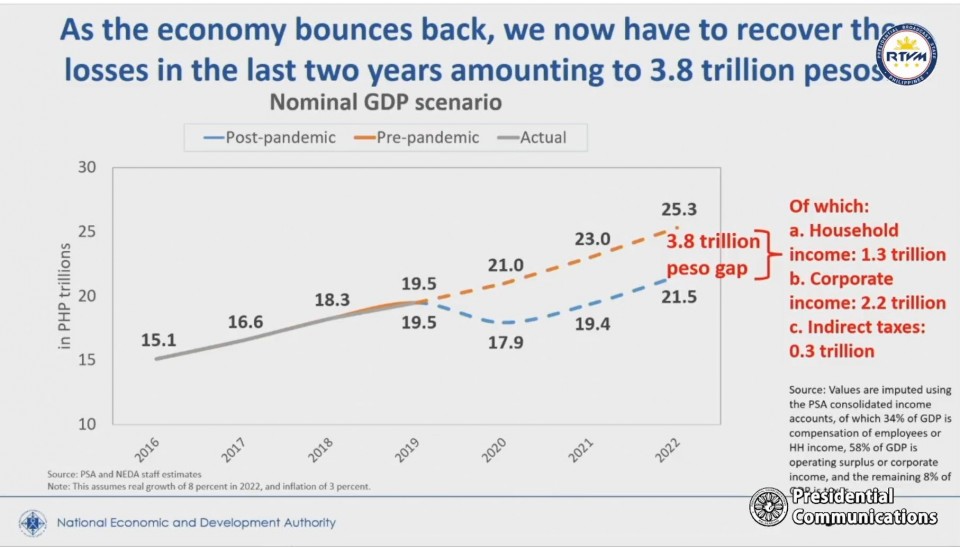 “As the economy bounces back, we now have to recover all the losses we experienced in the last two years. Iyong total amount na nawala sa atin ay 3.8 trillion pesos,” Chua reported to President Rodrigo Duterte during the latter’s “Talk to the People” on Monday, February 28.