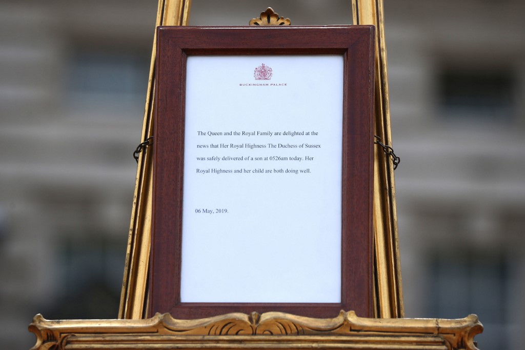 Despite the understated nature of Monday’s announcement, some royal enthusiasts gathered in Windsor and at Buckingham Palace, where a framed notice of the birth went on display on a ceremonial easel placed on the forecourt.