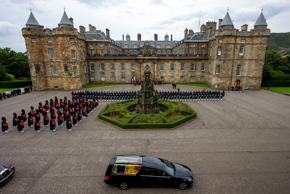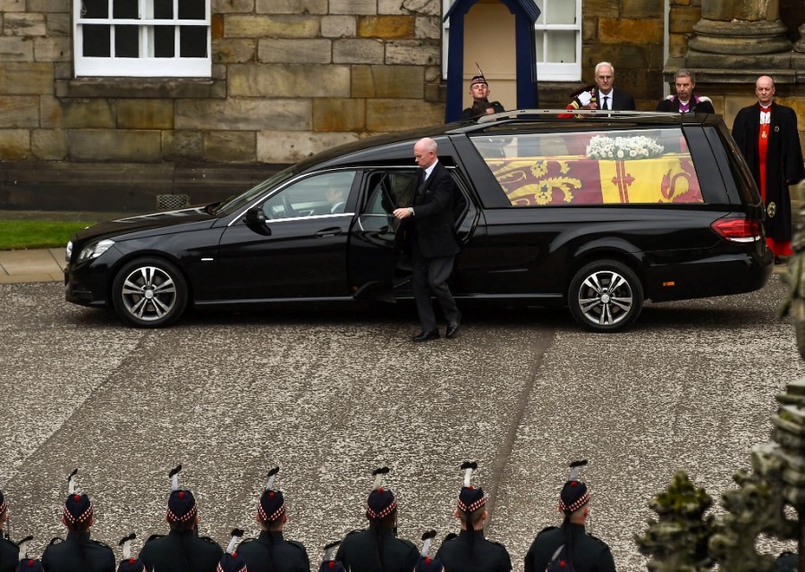 The hearse carrying the coffin of the late Queen Elizabeth II, draped with the Royal Standard of Scotland, arrives at the Palace of Holyroodhouse, in Edinburgh on September 11, 2022. – Queen Elizabeth II’s coffin will travel by road through Scottish towns and villages on Sunday as it begins its final journey from her beloved Scottish retreat of Balmoral. The Queen, who died on September 8, will be taken to the Palace of Holyroodhouse before lying at rest in St Giles’ Cathedral, before travelling onwards to London for her funeral.. (Photo by Lisa Ferguson / POOL / AFP)