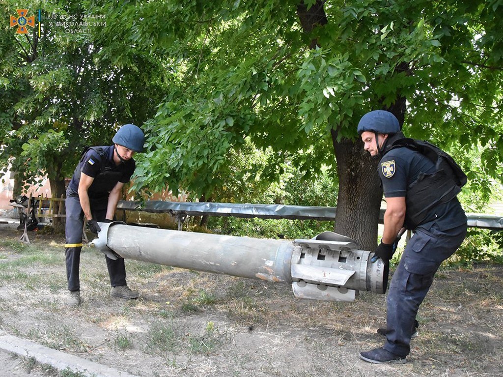 This handout picture taken and released by Ukrainian Emergency Service on July 31, 2022 shows rescuers carrying fragment of a missile in an open air sport ground after a strike in Mykolaiv. (Photo by Handout / UKRAINIAN EMERGENCY SERVICE / AFP)