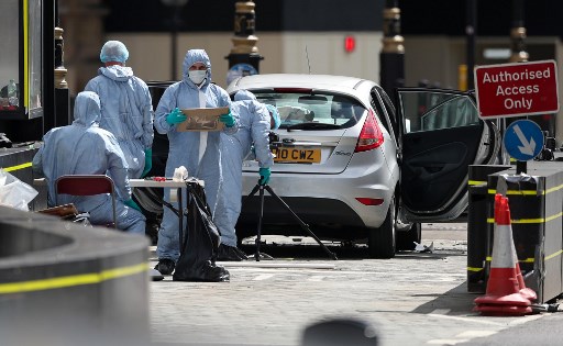 A car crashed into barriers outside Britain’s Houses of Parliament in a suspected terror attack on Tuesday, injuring a “number of pedestrians” yards from where five people were killed last year. Police said they had arrested the driver, in his 20s, and were holding him on suspicion of terrorist offences. / AFP PHOTO / Daniel LEAL-OLIVAS