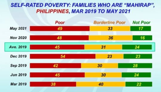 According to the SWS, based on the results of the poll conducted from April 28 to May 2, 2021, 49 percent, on the other hand, rated themselves as mahirap or poor, and 33 percent placed themselves on the borderline.
