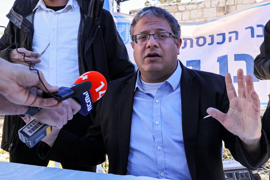 Itamar Ben-Gvir, member of Israel’s Knesset (parliament) and head of the one-man far right “Jewish Power” (Otzma Yehudit) party, speaks to reporters from a desk at his “make-shift office” in the east Jerusalem neighborhood of Sheikh Jarrah on February 13, 2022. (Photo by AHMAD GHARABLI / AFP)