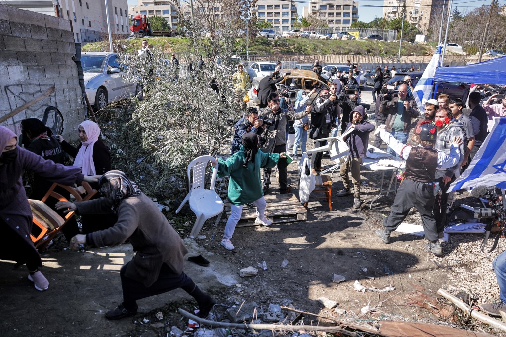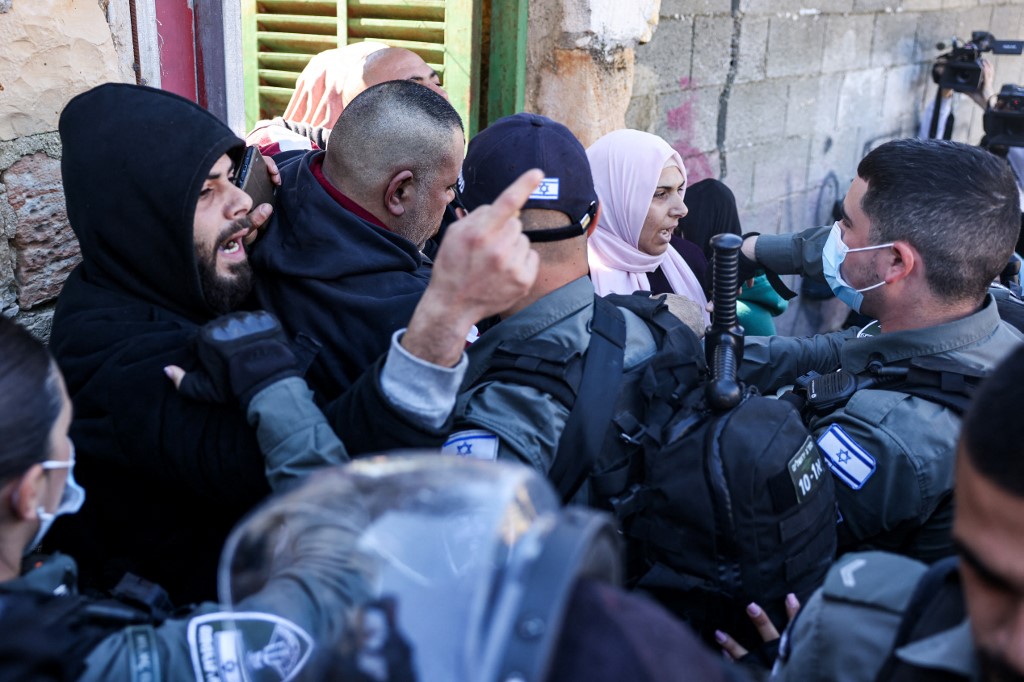 Palestinians confront Israeli security forces outside a house in the east Jerusalem neighborhood of Sheikh Jarrah on February 13, 2022. (Photo by AHMAD GHARABLI / AFP)