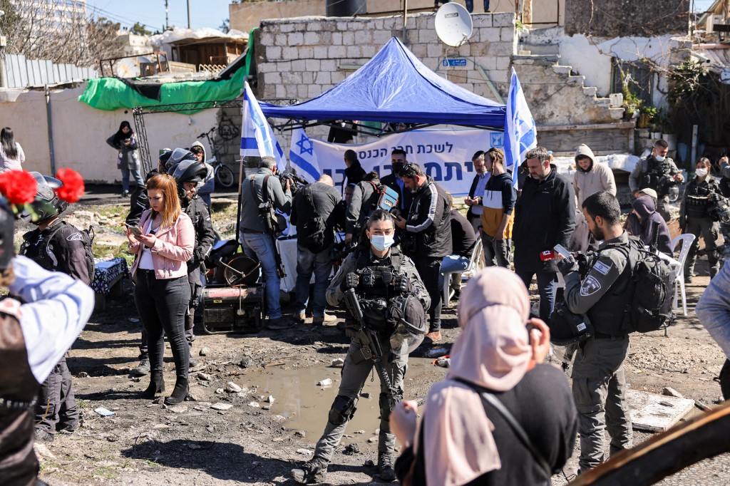 Israeli security forces stand guard by the “make-shift office” tent set up by Itamar Ben-Gvir, member of Israel’s Knesset (parliament) and head of the one-man far right “Jewish Power” (Otzma Yehudit) party in the east Jerusalem neighborhood of Sheikh Jarrah on February 13, 2022. (Photo by AHMAD GHARABLI / AFP)