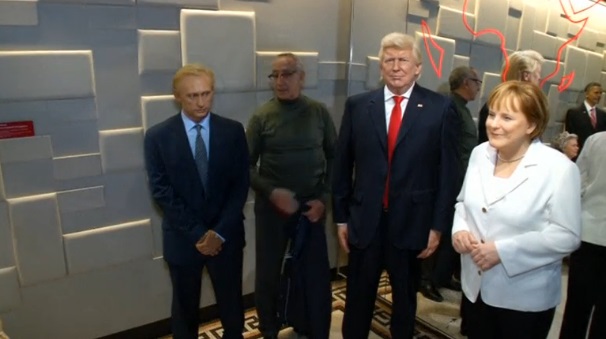 Dressed in a dark blue suit and a red tie, the wax version of Trump stood between the statues of Russian President Vladimir Putin and German Chancellor Angela Merkel.