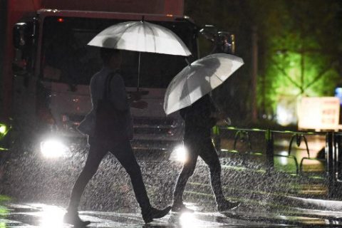 A powerful typhoon ripped into southern Japan on September 17, dumping torrential rain, grounding hundreds of domestic flights and halting train services. / AFP PHOTO /