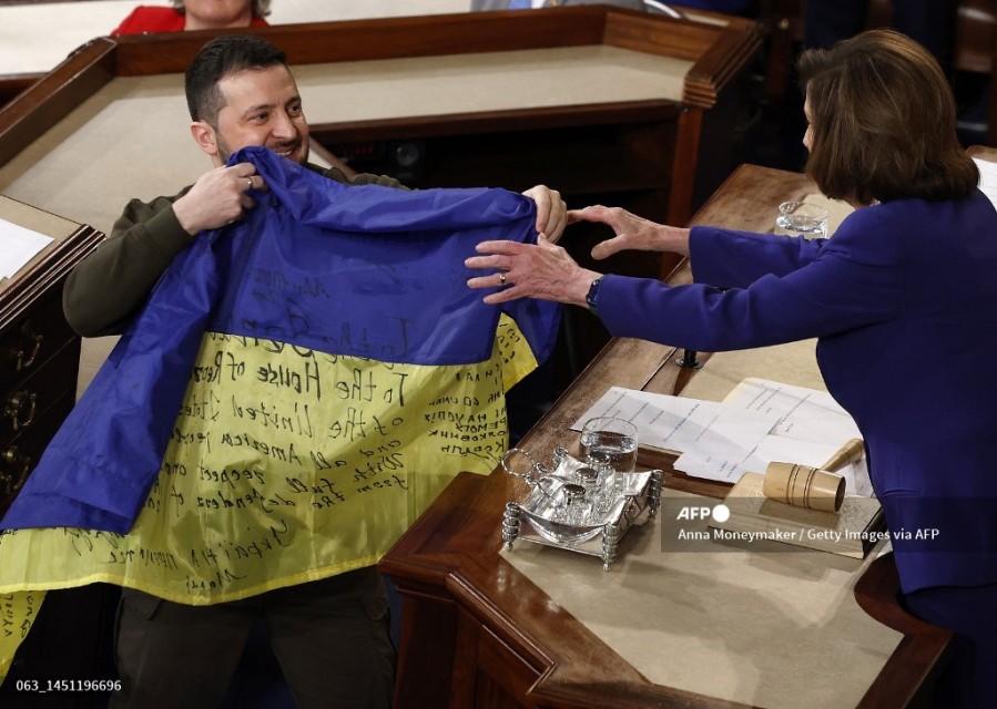 Zelensky — whose media savvy and rugged demeanor have helped rally world opinion — wore his trademark green military fatigues as he held talks at the White House and addressed Congress, where he handed over an Ukrainian flag fresh from the battlefield.