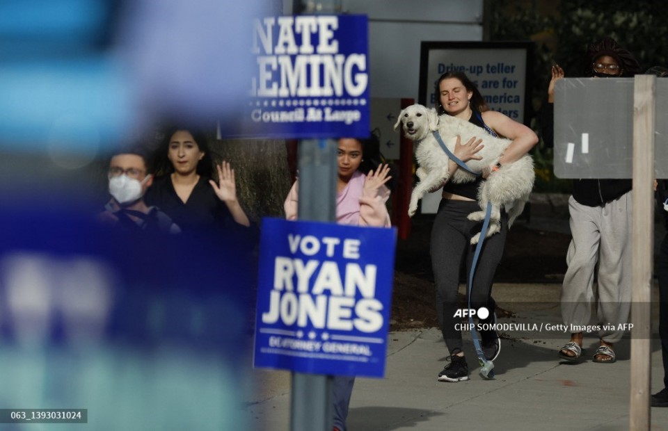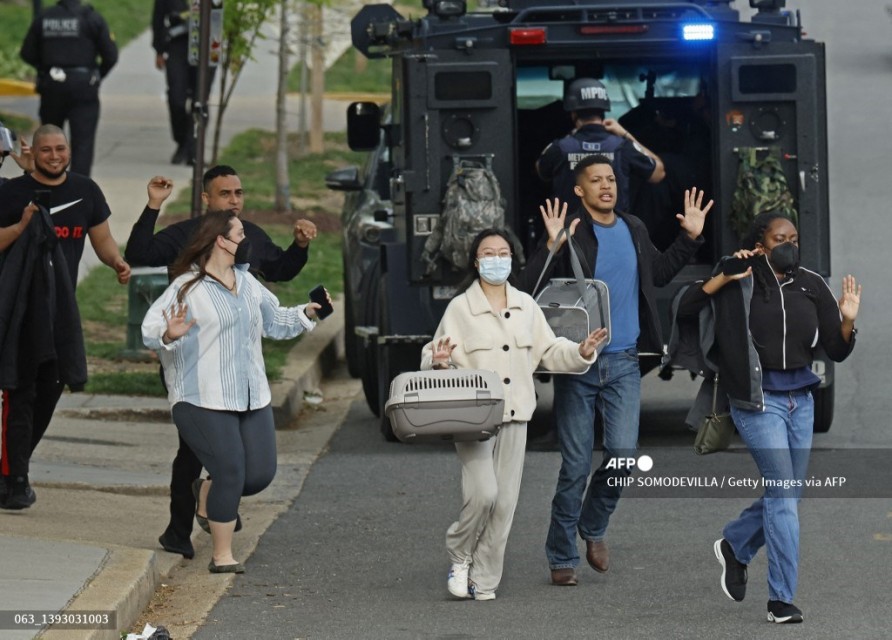 WASHINGTON, DC – APRIL 22: Police provide cover as area residents are told to run with their hands up while being evacuated from their homes after a shooting in the area left at least three people injured on April 22, 2022 in Washington, DC. Police evacuated residents from around the shooting Friday afternoon and there was a person arrested at the scene. (Photo by CHIP SOMODEVILLA / GETTY IMAGES NORTH AMERICA / Getty Images via AFP)