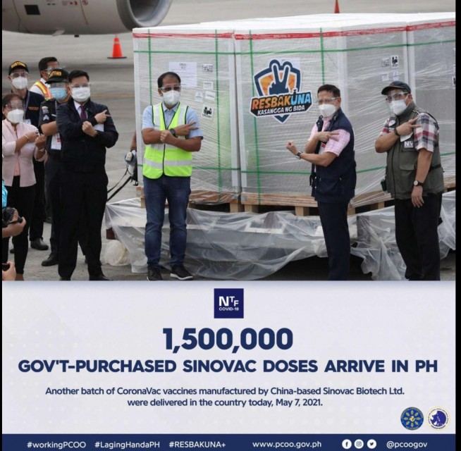 (Eagle News) — Some 1.5 million Sinovac doses from China arrived on Friday, May 7, bringing to 5 million the total number of Sinovac doses delivered to the country. This is the biggest batch of vaccine delivery so far to the Philippines.