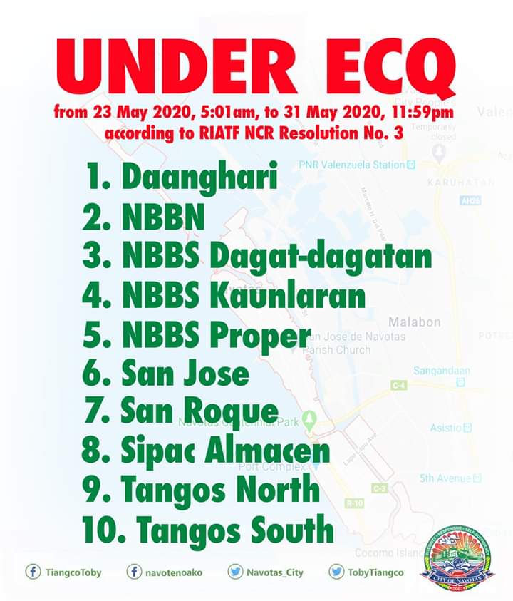 Mayor Toby Tiangco said Barangays NBBS Dagat-Dagatan, NBBS Kaunlaran, NBBS Proper, San Jose, NBBN, Sipac Almacen, Daanghari, Tangos North, Tangos South, and San Roque are under the ECQ starting today to May 31, at 11:59 p.m., following the approval of the Regional Inter-Agency Task Force for the Management of Emerging Infectious Diseases.