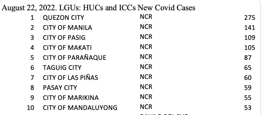 (Eagle News) – Ten cities of the National Capital Region (NCR) had the highest number of new COVID-19 cases on Monday, August 22, according to data extracted from the Department of Health.