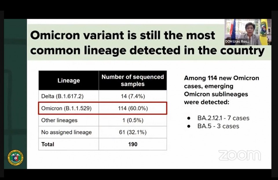 Majority or 60 percent of the sequenced samples were Omicron cases at 114 cases, while 61 cases or 32.1 percent had no assigned lineages.