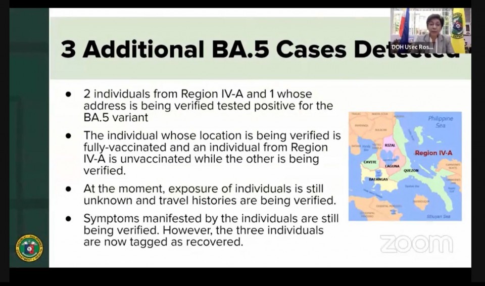 Of the three BA.5 cases, two are from Region 4-A or the Calabarzon region, while the other one is still being located.