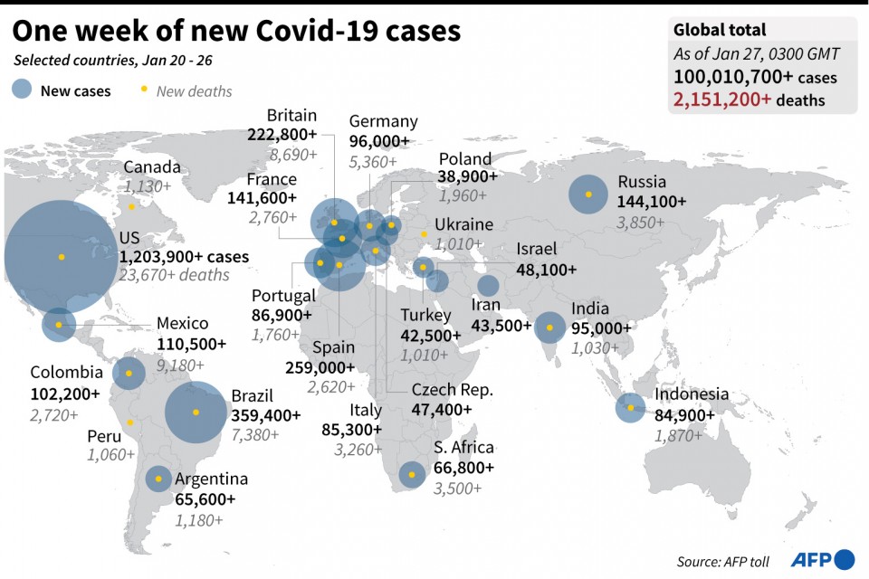 WASHINGTON, United States (AFP) — More than 100 million Covid-19 cases have now been recorded worldwide, according to an AFP tally on Tuesday, as newly-inaugurated President Joe Biden pledged to ramp up the United States’s struggling vaccine program.