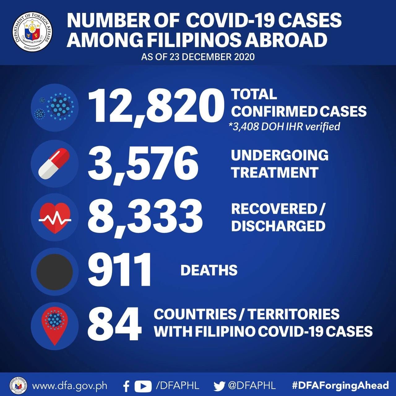 The Department of Foreign Affairs said the additional 104 recoveries pushed the COVID-19 recovery total among overseas Filipinos to 8333.