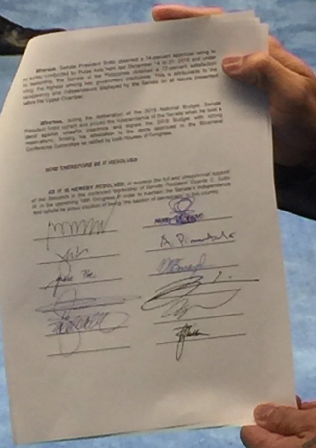 Senator Manny Pacquiao showed to reporters on Monday, June 3, the manifesto signed by himself; Senator Panfilo Lacson, who authored the resolution; Senators Aquilino Pimentel III, Gregorio Honasan II, Sherwin Gatchalian, Nancy Binay, Sonny Angara, and Joel Villanueva; Majority Leader Juan Miguel Zubiri; and Pro-tempore Ralph Recto, among others.