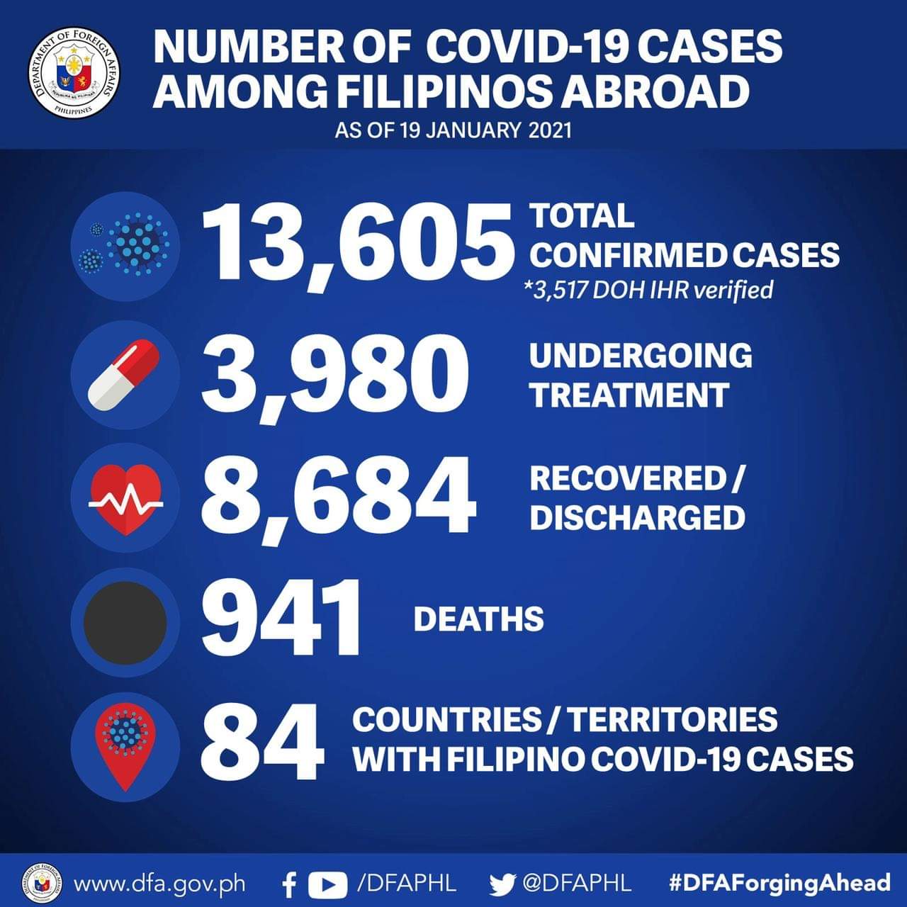 The Department of Foreign Affairs said the additional cases pushed the COVID-19 cases among Filipinos abroad to 13605.
