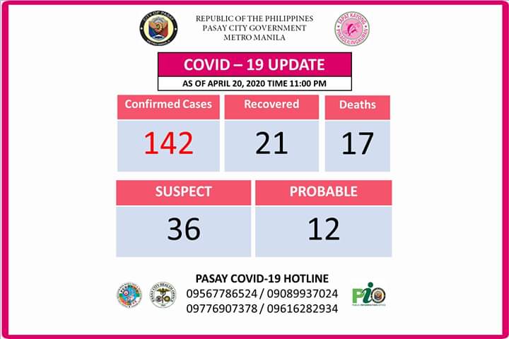 (Eagle News)–The number of coronavirus disease 2019 cases in Pasay has reached 142.