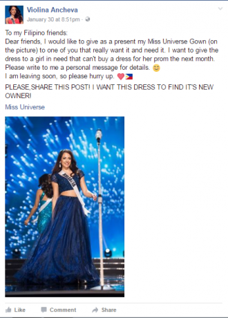 During the Miss Universe after-party, Miss Bulgaria Violina Ancheva posted on her Facebook account that she will be giving her Miss Universe gown as a gift to someone who really needs it.