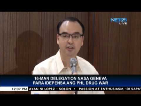 Pinangunahan nina Senador Alan Peter Cayetano at Deputy Executive Secretary Menardo Guevarra ang delegasyon upang idepensa ang war on drugs na inilunsad ng administrasyong Duterte.