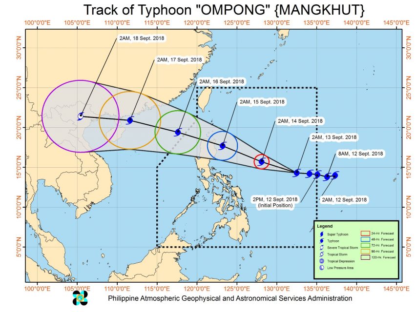 (Eagle News) — Typhoon Ompong has slightly accelerated as it continues to threaten Northern Luzon, packing powerful winds of 205 kilometers per hour and gusts of up to 255 kph.
