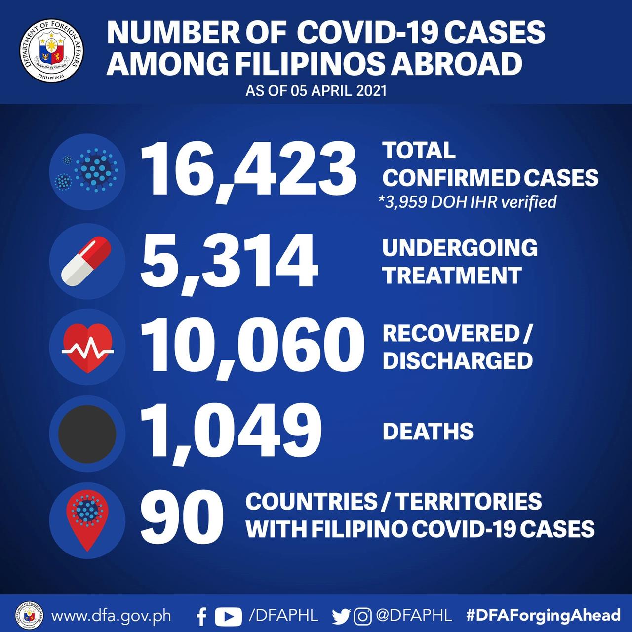 According to Department of Foreign Affairs data, the additional cases pushed the COVID-19 cases among Filipinos overseas to 16423.