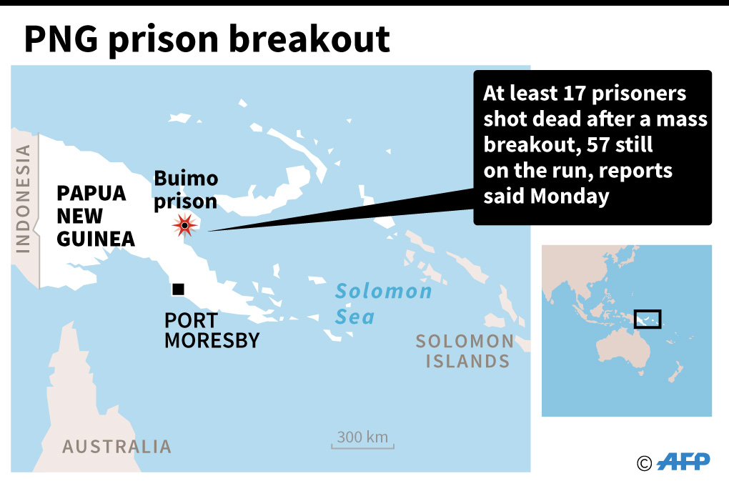 SYDNEY, Australia (AFP) – Seventeen prisoners have been shot dead after a mass breakout at a jail in Papua New Guinea, police said Monday, with 57 still on the run.