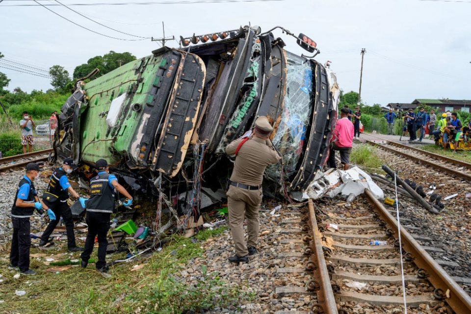 CHACHOENGSAO, Thailand (AFP) — At least 18 people were killed and more than 40 injured in Thailand Sunday when a freight train crashed into a bus taking passengers to a religious ceremony, officials said.