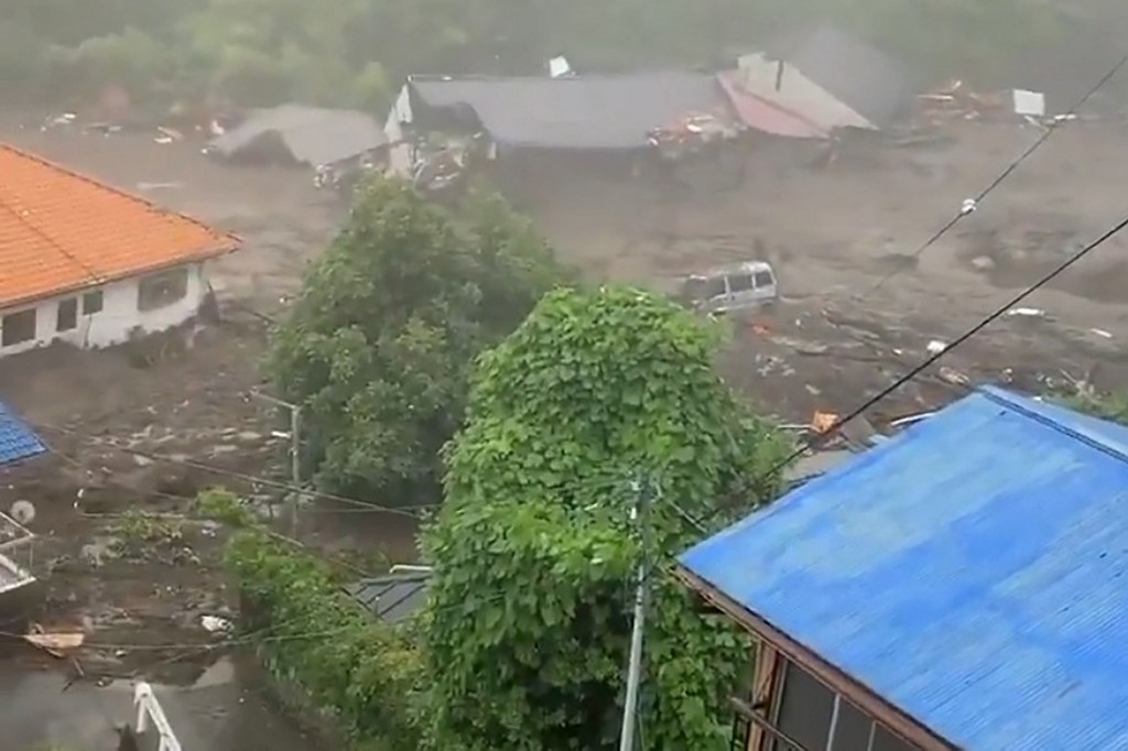 Television footage showed a torrent of mud obliterating some buildings and burying others in Atami, southwest of Tokyo, with people running away as it crashed over a hillside road.