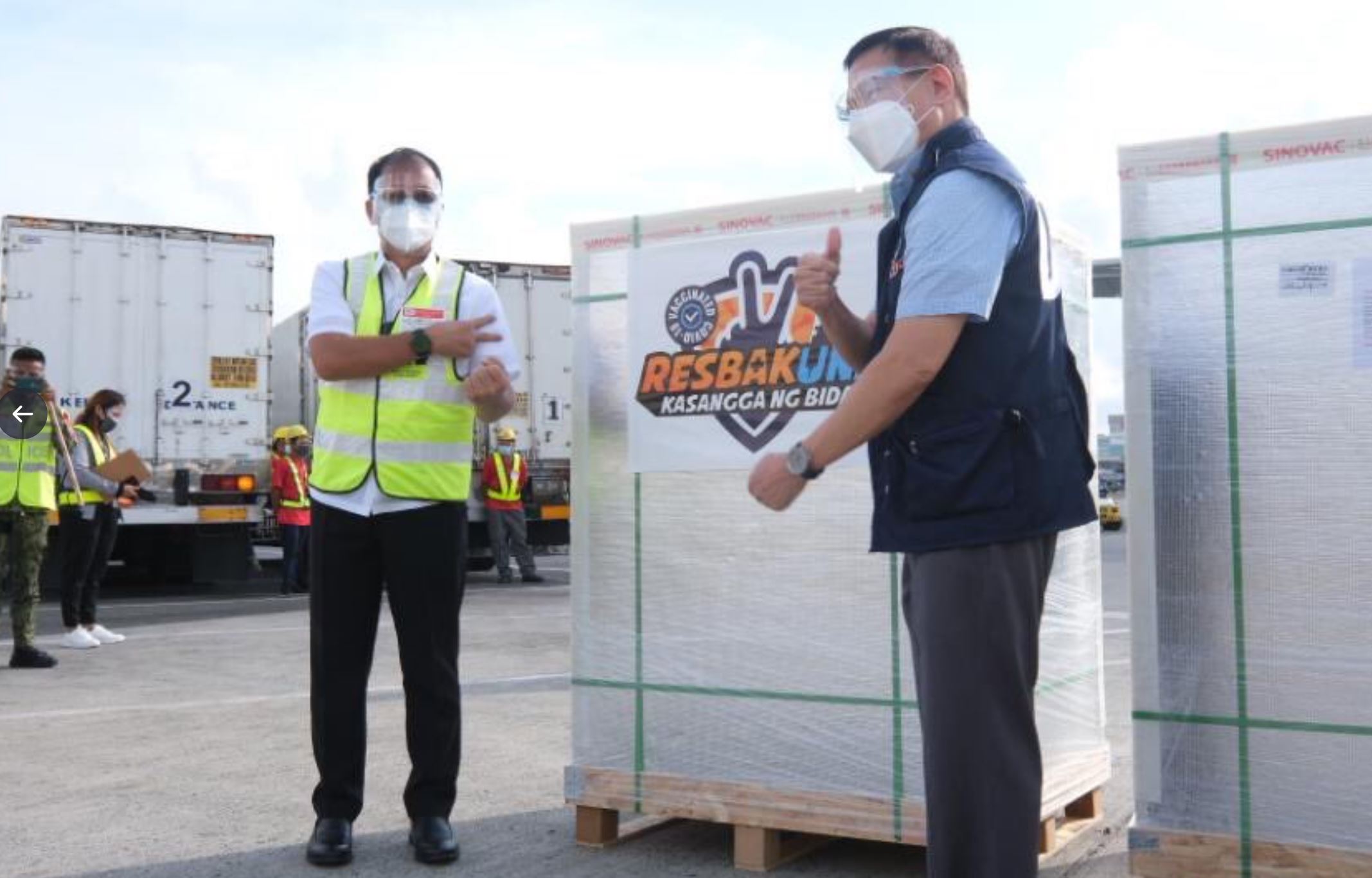 The vaccines under the brand name Coronavac were delivered via Cebu Pacific flight 5J671. These were welcomed by Health Secretary Francisco Duque III and vaccine czar Secretary Carlito Galvez Jr, who is also the National Task Force (NTF) against Covid-19 chief implementer.