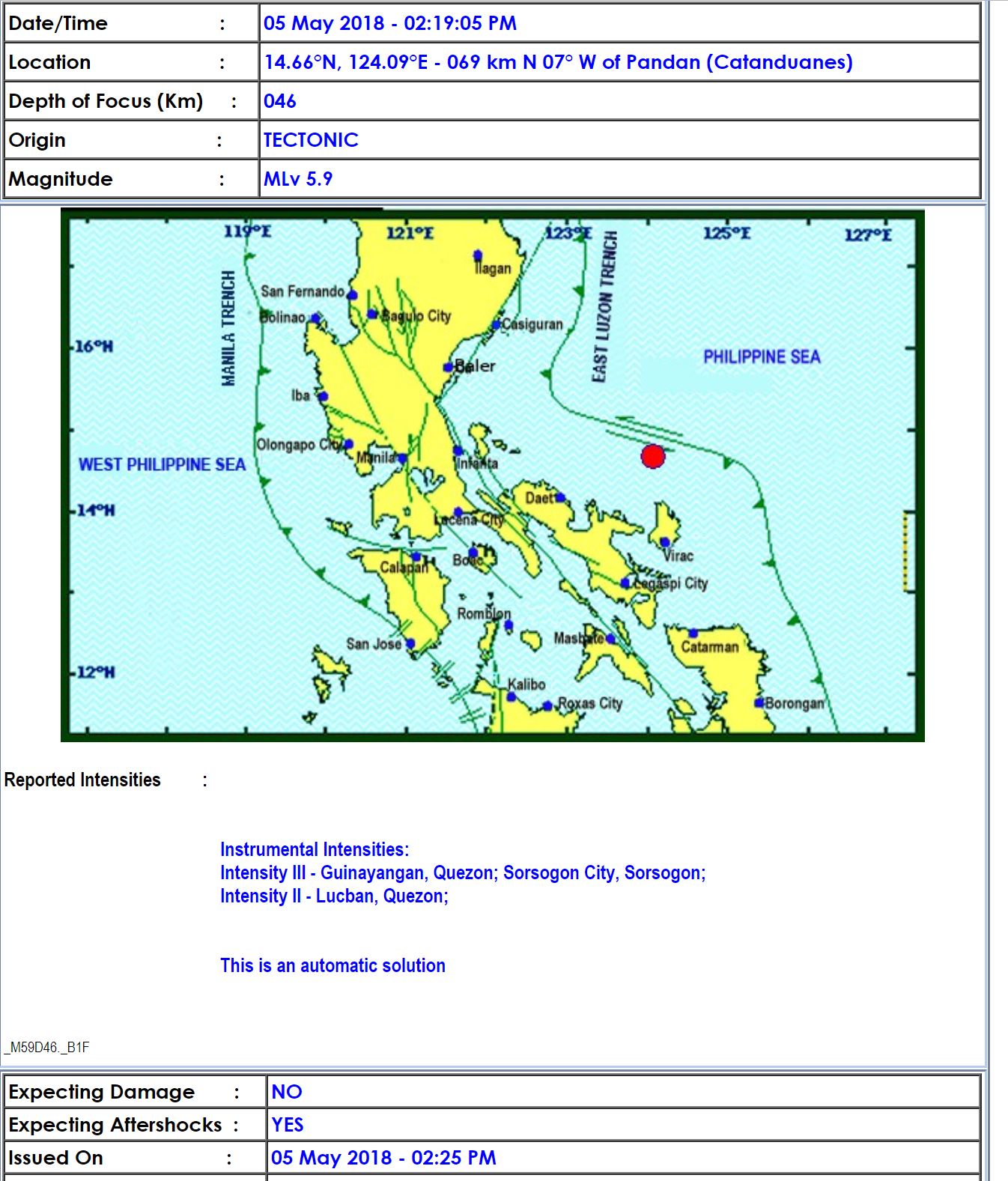 (Eagle News) – A 5.9 magnitude quake hit Catanduanes at 2:19 pm on May 5, Saturday, with a depth of 46 kilometers. This came four hours after a magnitude 4.6 quake hit the province, 19 kilometers south east of Baras.