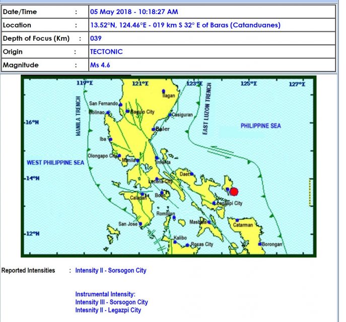 The 4.6 magnitude quake that hit Catanduanes at 10:18 a.m. was also felt at intensity 3 in Sorsogon City and intensity 2 in Legazpi City.