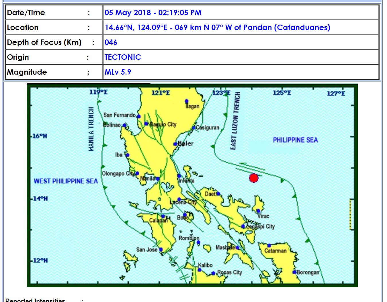 (Eagle News) – A 5.9 magnitude quake hit Catanduanes at 2:19 pm on May 5, Saturday, with a depth of 46 kilometers. This came four hours after a magnitude 4.6 quake hit the province, 19 kilometers south east of Baras.
